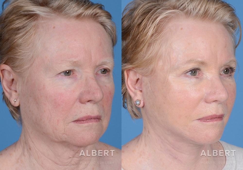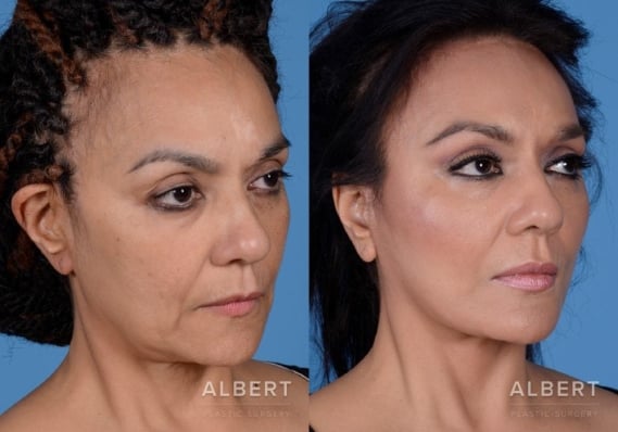 Full facelift. Dr. Albert can conduct a procedure that restores your appearance from the top of your forehead to your clavicle. He will revise excess skin and reposition features to their more youthful state. His priority is to prevent the face from appearing unnaturally tight. He often uses fat grafting to create a soft, natural appearance.